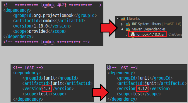 pom.xml에서 lombok 라이브러리 추가 + JUnit 버전 변경